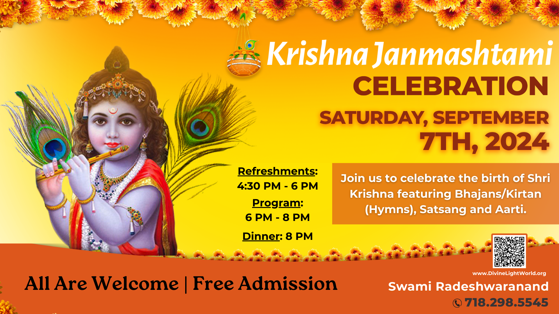 Shri Krishna Janmashtami is a yearly festival that celebrates the birth of Lord Krishna. At Divya Jyoti, we will commemorate this joyous occasion with a special cultural program. We invite you to join us for traditional song and dance performances, and enlightening stories of Lord Krishna’s life.